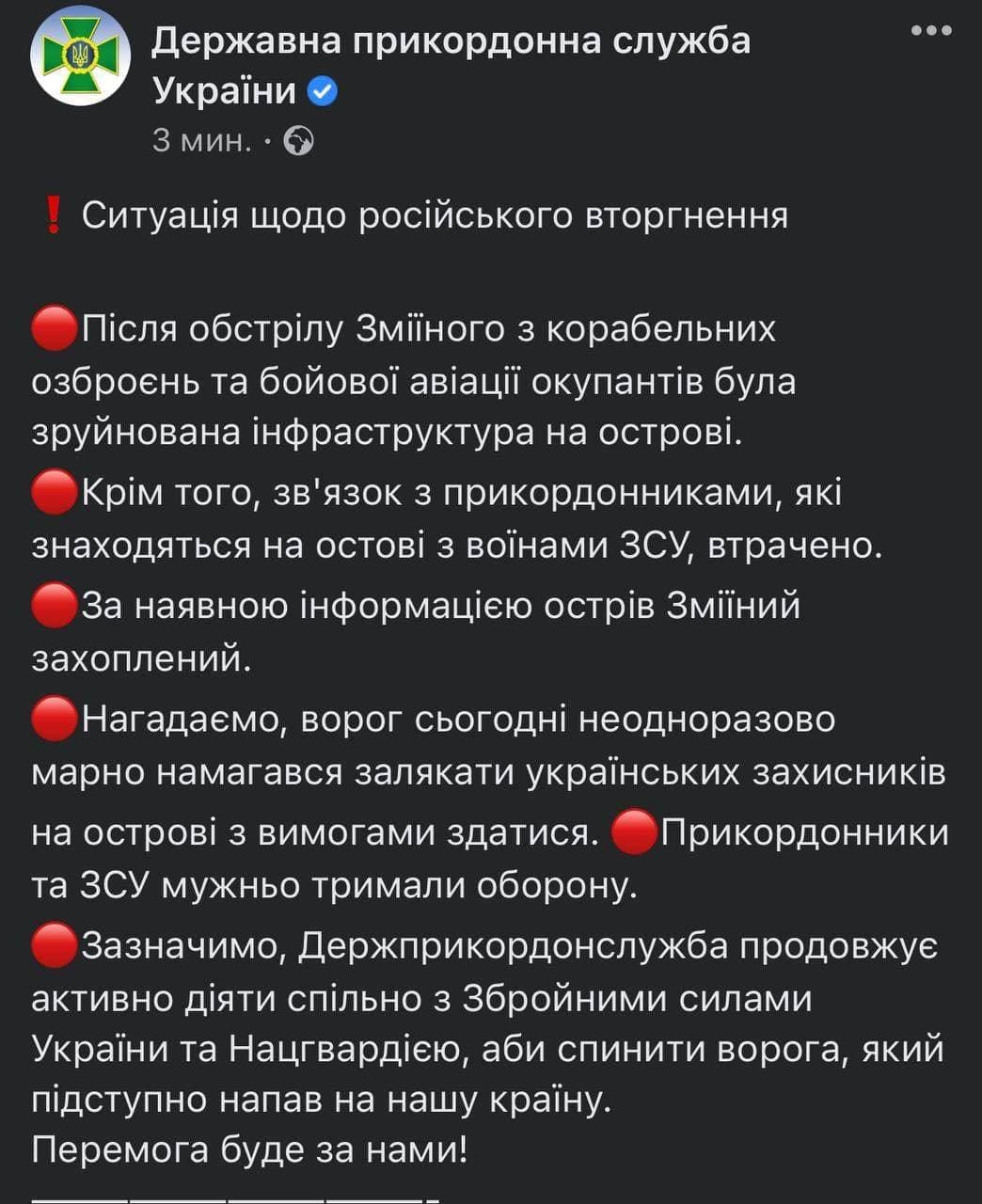 Остров Змеиный захвачен россиянами. Об этом сообщает пресс-служба Государственной пограничной службы Украины в Facebook.