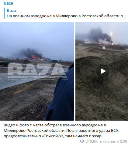 В сети опубликовано видео, как сообщается, последствий удара украинской армии по военному аэродрому в Миллерово Ростовской области.