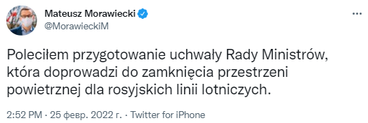 "Я приказал подготовить постановление Совета министров, которое приведет к закрытию воздушного пространства для российских авиакомпаний", - подчеркнул Моравецкий в Twitter.