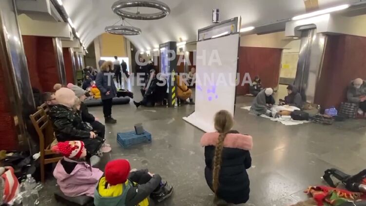 Появилось видео, как родители с детьми ждут обстрелов в киевской подземке. Детям установили кинотеатр