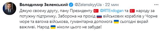 "Спасибо моему другу, господину президенту Реджепу Эрдогану и турецкому народу за мощную поддержку. Запрет на проход российских военных кораблей в Черное море и весомая военная, гуманитарная помощь для Украины сегодня крайне важны. Народ Украины никогда этого не забудет!" - говорится в твите.