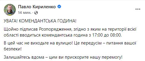 21:50 Новое обращение Кличко. Говорит, что завтра в 8 утра заканчивается комендантский час. Но в 22-00 он снова возобновится.