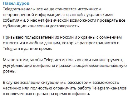 "Мы не хотим, чтобы Telegram использовался как инструмент, усугубляющий конфликты и разжигающий межнациональную рознь. В случае эскалации ситуации мы рассмотрим возможность частично или полностью ограничить работу Telegram-каналов в вовлеченных странах на время конфликта", - написал Дуров.