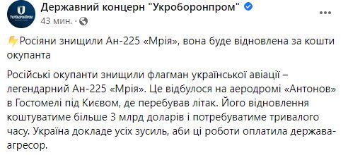 17:37 В Укроборонпроме подтвердили уничтожение самолета Ан-225 "Мрия" в аэропорту "Антонов" в Гостомеле и заявили, что его восстановление будет стоить 3 млрд долларов. Самолет находился на ремонте, поэтому не успел вылететь из Украины, - сообщили в госконцерне.