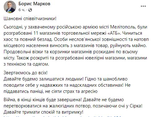 21:32 В захваченном Мелитополе мародеры грабят магазины. Генеральный директор корпорации АТБ Борис Марков сообщил об 11 разграбленных супермаркетах в городе.