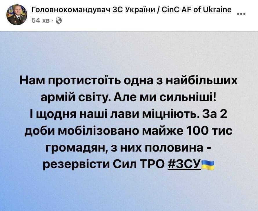 "Нам противостоит одна из величайших армий мира. Но мы сильнее! И каждый день наши ряды крепнут. За два дня мобилизовано почти 100 тысяч граждан, из них половина - резервисты Сил ТРО" - говорится в сообщнии.