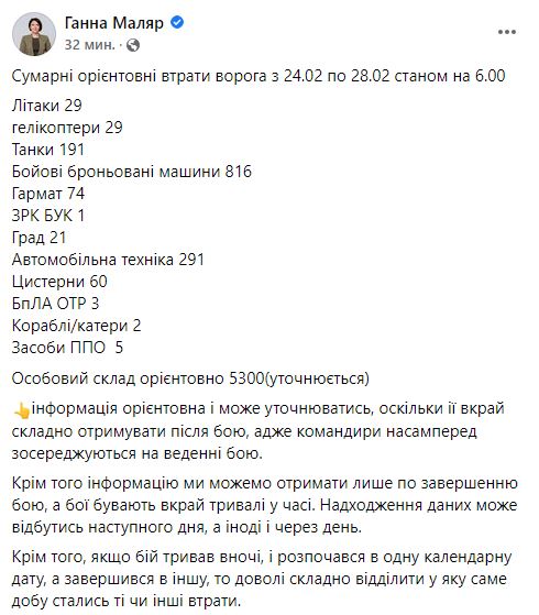 09:07 Ориентировочные потери российской армии по состоянию на утро 28 февраля. Данные опубликовала замминистра обороны Анна Маляр.