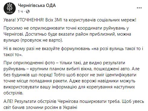 "Просим не публиковать точные координаты разрушений в Чернигове. Достаточно указать район приблизительный, можно улицу (переулок не стоит). Ни в коем случае не указывайте формулировок "на углу улиц такой и такой". При обнародовании фото – только такие, где видны результаты разрушений – крупным планом выбиты окна, поврежденные автомобили. Но без домов, что рядом!