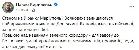 "Работаю над предоставлением зеленого коридора – для завоза в Волноваху гуманитарной помощи, медикаментов, продуктов, воды, а также для эвакуации жителей" - написал глава ОГА Павел Кириленко.