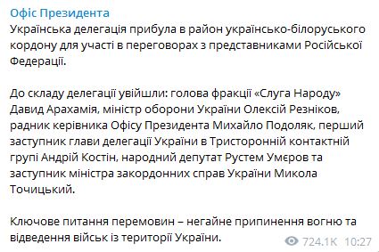 "Украинская и российская делегации, которые встретились в районе украинско-белорусской границы, провели первый раунд переговоров с целью нахождения точек соприкосновения для скорейшего прекращения огня и боевых действий.