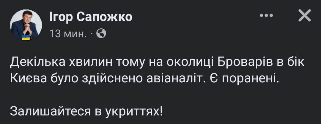 19:27 Мэр Броваров говорит о 6 раненных в ходе авианалета.
