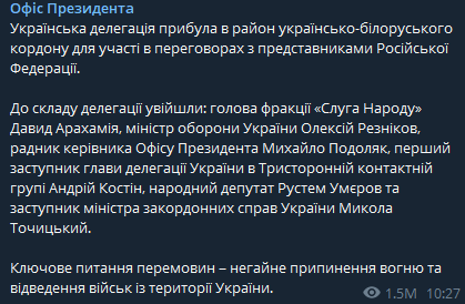 Также в Офисе президента Украины сообщили, что в составе украинской делегации: