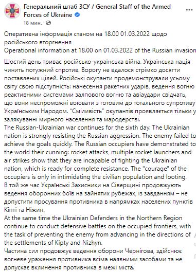 Вечером 1 марта Генштаб ВСУ дал сводку о ситуации по российскому вторжению.