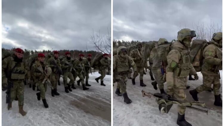 Около сотни военных в камуфляжной одежде, беретах, автоматами и рюкзаками за спиной маршируют по снегу.