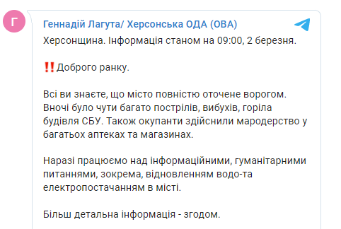 "Все вы знаете, что город полностью оцеплен врагом. Ночью было слышно много выстрелов, взрывов, горело здание СБУ. Также оккупанты совершили мародерство во многих аптеках и магазинах", - сообщает ОГА.