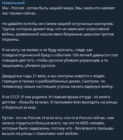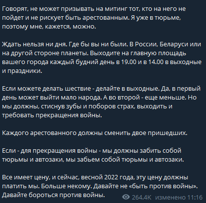 Если можете делать шествие - делайте в выходные. Да, в первый день может выйти не достаточно народа. А во второй - еще меньше. Но мы должны, стиснув зубы и поборов страх, выходить и требовать прекращения войны..", - призвал Навальный.
