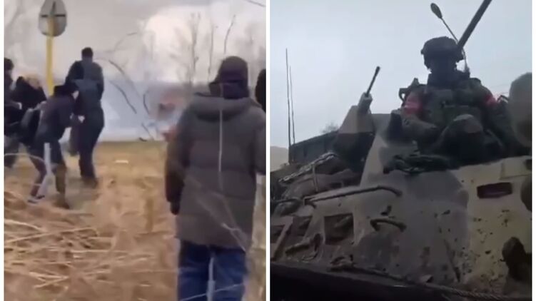 А вот ещё один пример - встреча российских войск на подходе к Водяному Запорожской области. Люди перекрывают дорогу российской военной технике. Слышны взрывы, автор видео говорит, что мужчине оторвало ногу.
