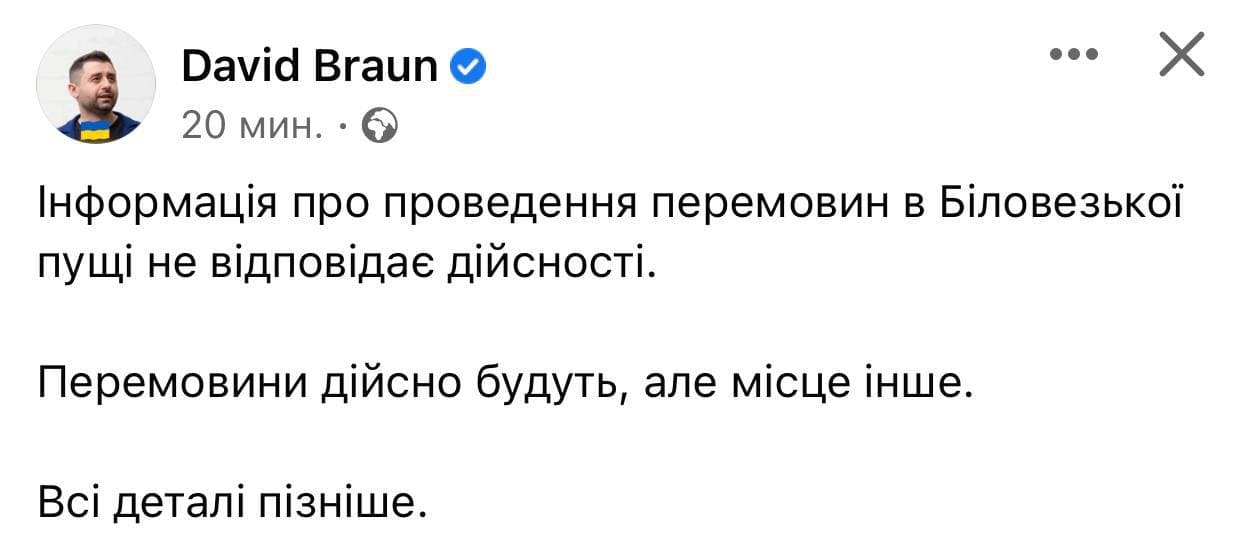"Информация о проведении переговоров в Беловежской пуще не соответствует действительности. Переговоры действительно будут, но место другое. Все детали позже", - написал он у себя в Facebook.