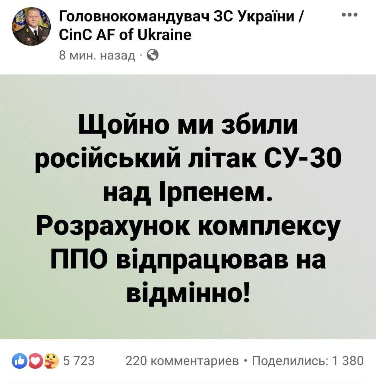"Расчет комплекса ПВО отработал на отлично!" - добавил главнокомандующий ВСУ.