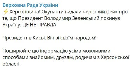 "Оккупанты выдали очередной фейк о том, что президент Владимир Зеленский покинул Украину. Это неправда. Президент в Киеве. Он со своим народом!" - говорится в сообщении.