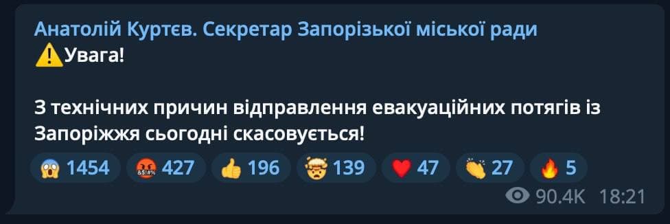 "По техническим причинам отправление эвакуационных поездов из Запорожья сегодня отменяется", говорится в сообщении.