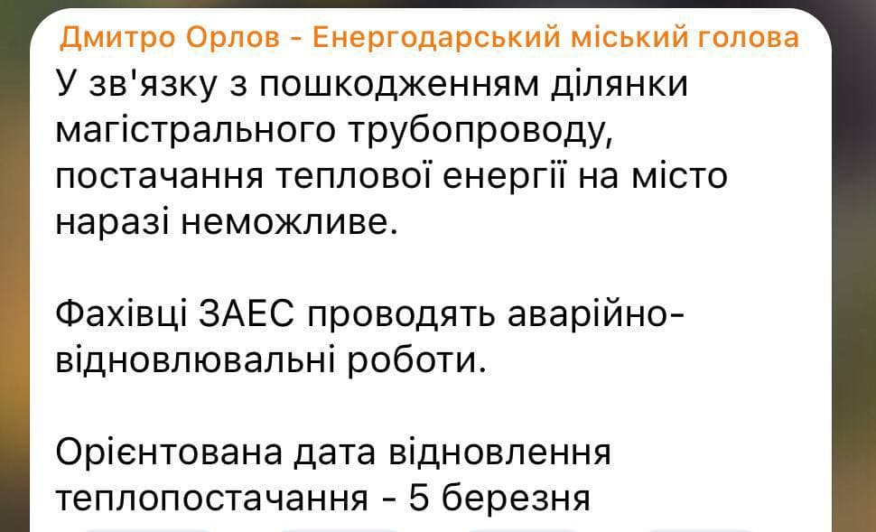 "В связи с повреждением участка магистрального трубопровода, поставка тепловой энергии на город пока невозможна. Специалисты ЗАЭС проводят аварийно-восстановительные работы. Ориентировочная дата возобновления теплоснабжения – 5 марта", - сообщил городской голова.