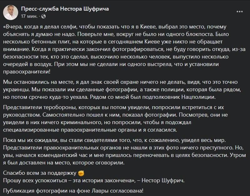 "Вчера, когда я делал селфи, чтобы показать что я в Киеве. Поверьте мне, вокруг не было ни одного блокпоста. Было несколько бетонных плит, на которые в сегодняшнем Киеве уже никто не обращает внимание. Потом, не буду говорить откуда, из-за безопасности тех, кто это сделал, выскочило несколько человек, выпустило несколько очередей в воздух. При этом мы не сделали ни одного выстрела, что и установили правоохранители!