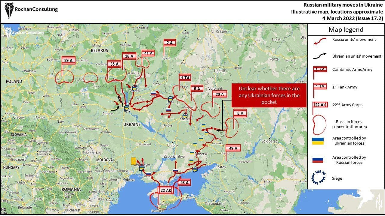 По мнению украинских военных, РФ сосредоточивает основные усилия на окружении Киева, Харькова, Николаева, выходе на административные границы в Луганской и Донецкой областях, создании сухопутного коридора из Крыма.