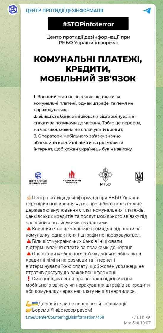 Центр противодействия дезинформации при СНБО Украины опровергает слухи о якобы гарантированном государством аннулировании счетов за коммунальные услуги, банковских кредитов и услуг мобильной связи во время войны.