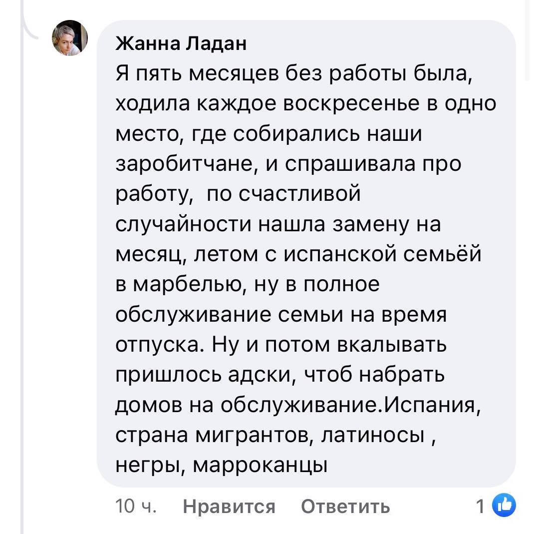 "Я пять месяцев без работы была, ходила каждое воскресенье в одно место, где собирались наши заробитчане и спрашивала про работу. По счастливой случайности нашла замену на месяц, летом с испанской семьей в Марбелью. Ну, в полное обслуживание семьи на время отпуска. Ну и потом вкалывать пришлось адски, чтобы набрать домов для обслуживания", - рассказала Ладан.