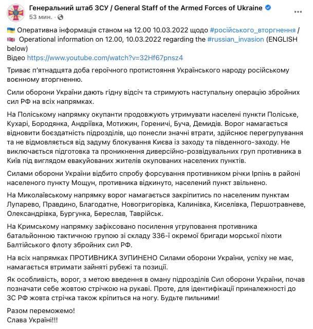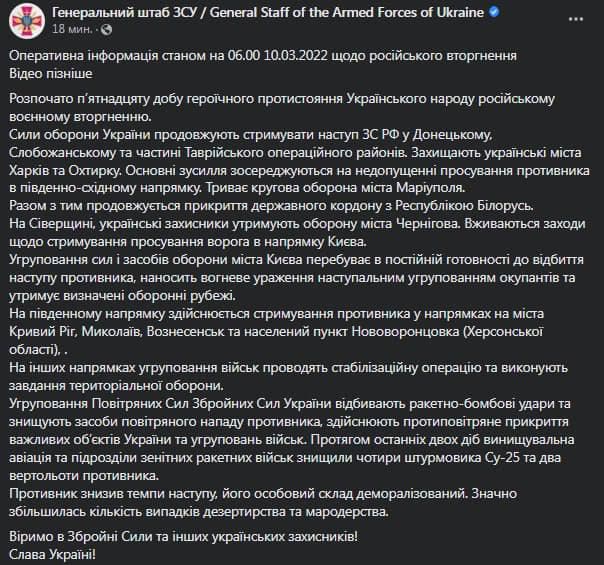 - В северном направлении украинские защитники удерживают оборону города Чернигов. Принимаются меры по сдерживанию продвижения врага в направлении Киева.