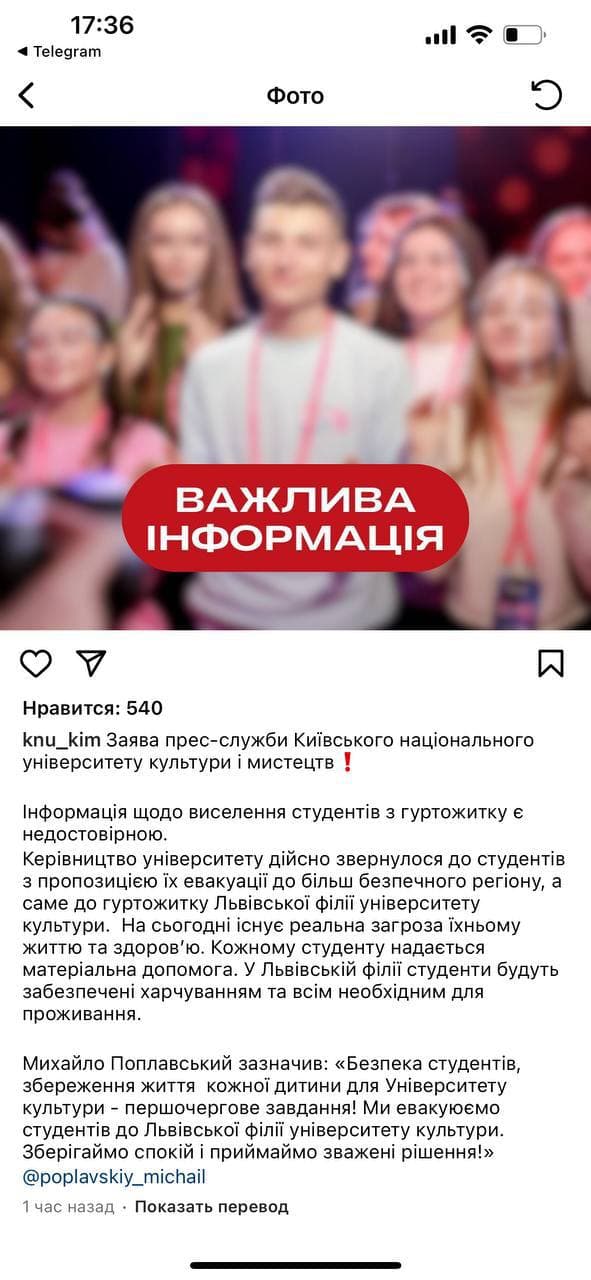 17:40 В Университета культуры написали, что информация о выселении студентов из общежития является недостоверной. Мол им предлагали перебазироваться в более безопасное место - во Львовскую филию вуза.