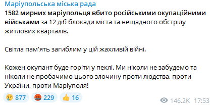 "1582 мирных мариупольца убиты российскими оккупационными войсками за 12 суток блокады города и беспощадного обстрела жилых кварталов", - говорится в сообщении.