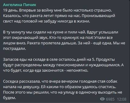 Запасов еды на складе в посёлке хватит на 5 дней, продукты будут распределять, в первую очередь, между пенсионерами и нуждающимися. "Что будет, когда еда закончится - непонятно", - описывает ситуацию Ангелина Пичик. В посёлке появились стаи голодных собак, люди стараются не выходить на улицу в одиночку.