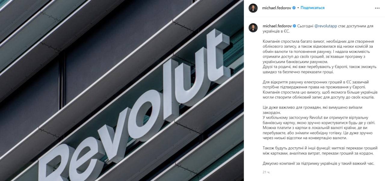 10.23 Министр цифровой трансформации Украины Михаил Фёдоров написал в Инстаграм, что в мобильном приложении Revolut украинцы смогут получить виртуальную банковскую карту, которой можно пользоваться повсюду, платить в локальной валюте страны, где вы находитесь или снимать наличные.