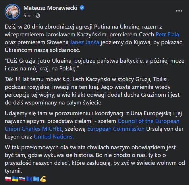 21.10 Премьеры Польши, Чехии и Словении прибыли в Киев. Об этом сообщил польский премьер Матеуш Моравецкий. Политики приехали по железной дороге и планируют провести переговоры с Владимиром Зеленским и Денисом Шмыгалем.