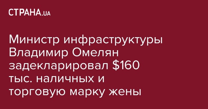 Министр инфраструктуры Украины Владимир Омелян задекларировал торговую марку и $160 тыс. наличными.