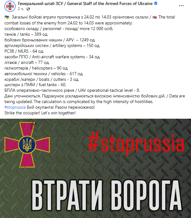 Генштаб ВСУ обновил данные о боевых потерях российских оккупантов за 18 дней войны по состоянию на  утро 14 марта.
