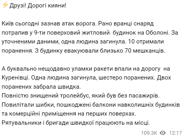 "Киев сегодня подвергся атакам врага. Ранним утром снаряд попал девятиэтажный жилой дом на Оболони. По уточненным данным, один человек погиб. 10 получили ранения. Из дома эвакуировали около 70 человек", - пишет мэр столицы.