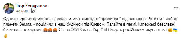 "Одно из первых поздравлений с юбилеем мне сегодня "прилетело" от рашистов. Русские - д@рьмо планеты Земля, – попали в наш дом под Киевом", - написал в соцсети Кондратюк.