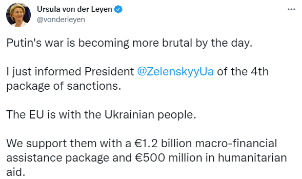 "Война Путина с каждым днем становится все более жестокой. Я только что проинформировала президента Зеленского о 4-м пакете санкций. ЕС с украинским народом. Мы поддерживаем их пакетом макрофинансовой помощи в размере 1,2 млрд евро и гуманитарной помощью в размере 500 млн евро", - написала президент ЕК.