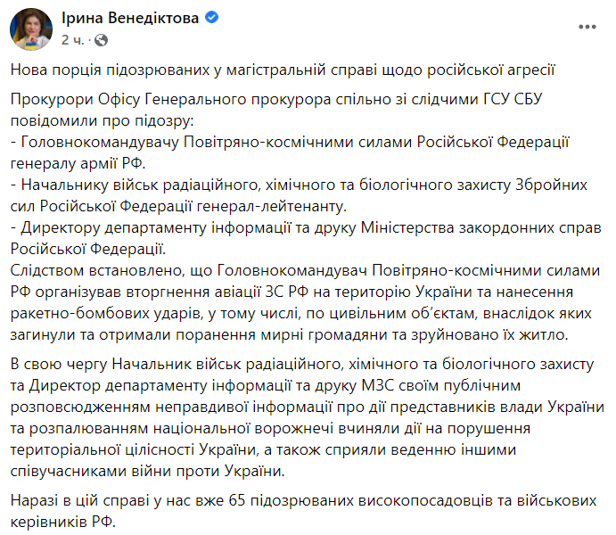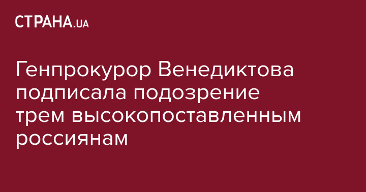 Генеральный прокурор Украины Ирина Венедиктова объявила о подозрении ряду высокопоставленных россиян. Об этом сообщается в Facebook чиновницы.