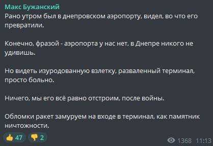 "Конечно, фразой - аэропорта у нас нет, в Днепре никого не удивишь. Но видеть изуродованную взлетку, разваленный терминал, просто больно. Ничего, мы его всё равно отстроим, после войны. Обломки ракет замуруем на входе в терминал, как памятник ничтожности", - написал нардеп.