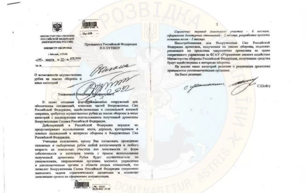 Об этом говорится в письме Шойгу от 4 марта, "О возможности вырубки на землях обороны" в адрес президента РФ Владимира Путина, которое опубликовало Главное управление разведки (ГУР) Министерства обороны Украины в своем Telegram-канале.