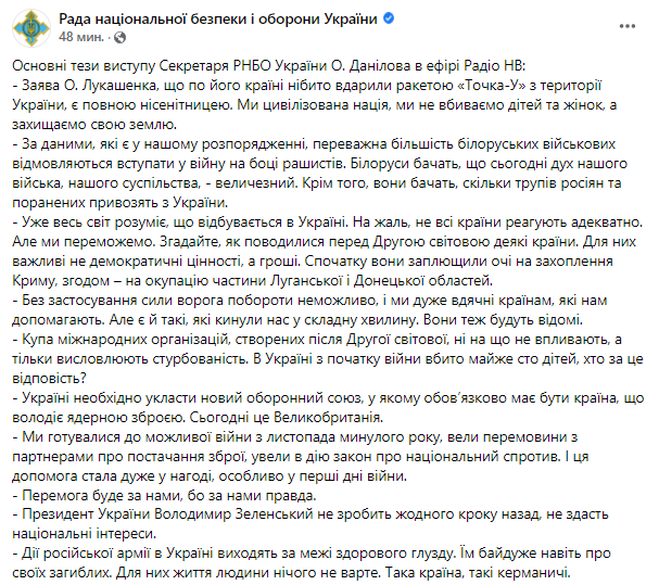 Секретарь СНБО Украины Алексей Данилов заявил, что Киеву нужно войти в новый "оборонный союз" (то есть, не НАТО), в котором обязательно должна быть страна с ядерным оружием. По его мнению, это может быть Британия.