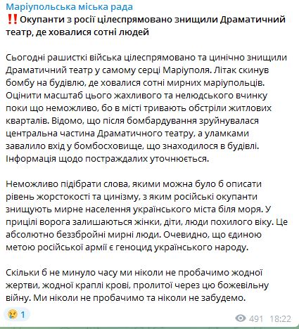 18.20 Мариупольский горсовет пишет, что российский самолет сбросил бомбу на драматический театр в самом сердце города. В нем укрывались сотни людей. Вход в бомбоубежище завалило обломками.
