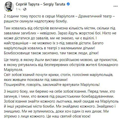Нардеп Сергей Тарута пишет, что россияне бросили сверхмощную бомбу на Мариупольский драматический театр, который находился в самом центре города.