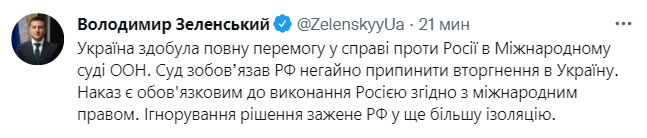 "Украина одержала полную победу по делу против России в Международном суде ООН. Суд обязал РФ немедленно прекратить вторжение в Украину. Приказ является обязательным для выполнения Россией согласно международному праву. Игнорирование решения приведет РФ в еще большую изоляцию", - написал Зеленский в Тwitter.