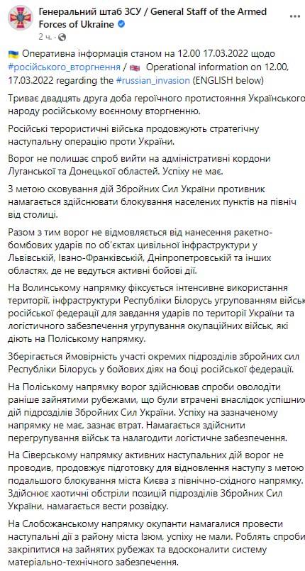 Напомним, война в Украине продолжается уже 22-й день. "Страна" следит за обстановкой на фронте и ситуацией в городах в обновляемом онлайне.