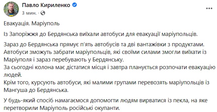 - из Мариуполя в Запорожье. Выехала колонна автобусов для перевозки людей из Бердянска в Запорожье. Также в сторону Бердянска выехали фуры с продуктами для помощи мариупольцам в Бердянске. Также оказывается помощь мариупольцам, которые оказались в городе Мангуш (они туда идут пешком) – оттуда их увезут в Бердянск.